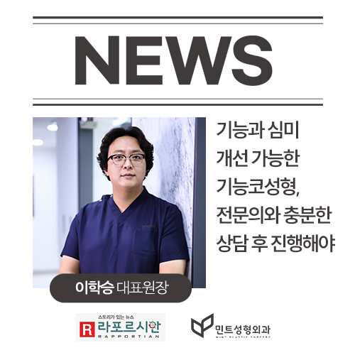 강남 민트성형외과 이학승 원장은 “기능코성형을 위해서는 먼저 어떤 점이 문제가 되는지 CT 촬영 등을 통해 문제점을 찾아야 한다. 그렇기 때문에 코의 구조에 대한 이해도가 높고 숙련된 전문 의료진이 있는 병원을 선택하는 것이 바람직하다”고 전했으며 이어서 “기능코성형의 목적을 해치지 않도록 기능적인 부분이 충분히 개선되어야 하기에 미적인 부분에만 집중되지 않게 수술이 진행되어야 한다”며 “경험이 풍부한 의료진과 충분한 상담이 필요한 수술 방법이다”라고 전했다.